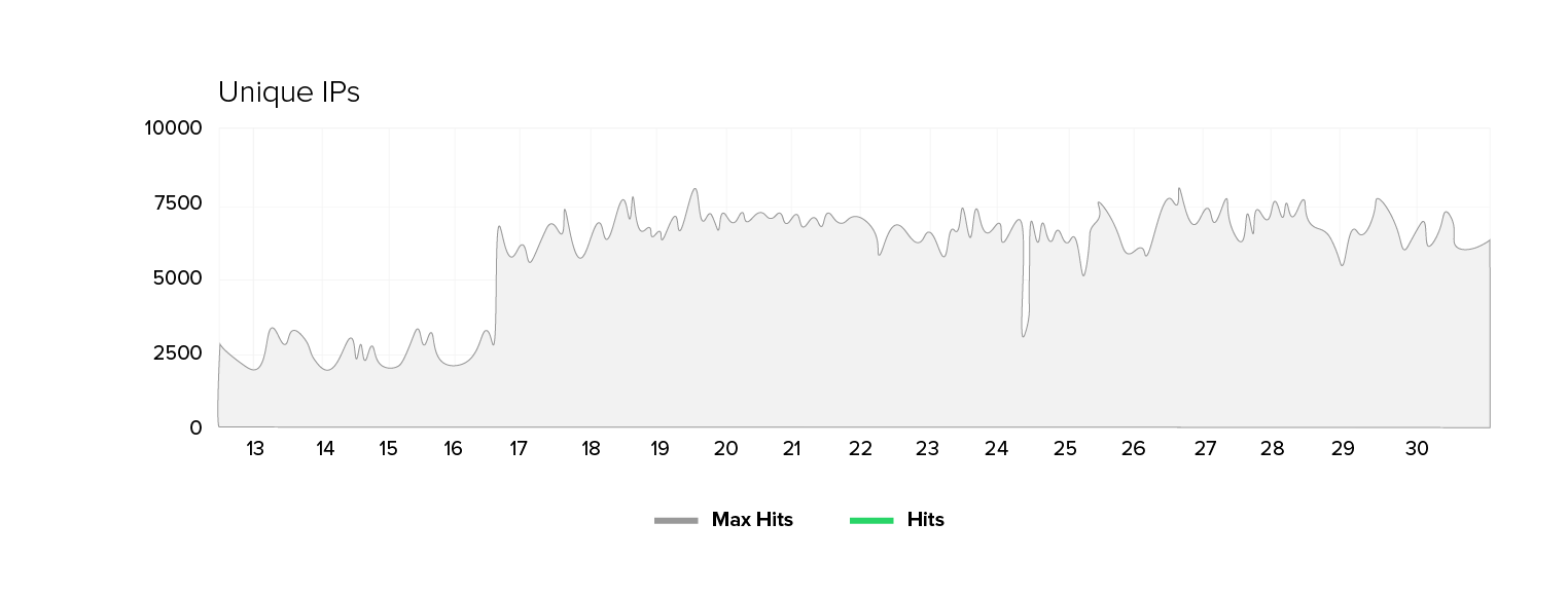 Seit einiger Zeit beobachten wir bei einem unserer Kunden aus dem öffentlichen Sektor einen ungewöhnlichen Effekt: Die Zahl der Unique IPs ist sprunghaft angestiegen, von den üblichen 2.000 bis 2.500 auf regelmäßig 5.000 bis 8.000 in den Spitzenzeiten. Wer bei dieser Verdopplung der Besucherzahlen eine proportionale Zunahme der Anfragen und der benötigten Bandbreite erwartet, erlebt eine Überraschung: Die Bandbreite und das Request-Volumen steigen nur moderat (in diesem Fall um den Faktor 1,3 bis 1,7), während die Zahl der Unique IPs quasi konstant erhöht bleibt.