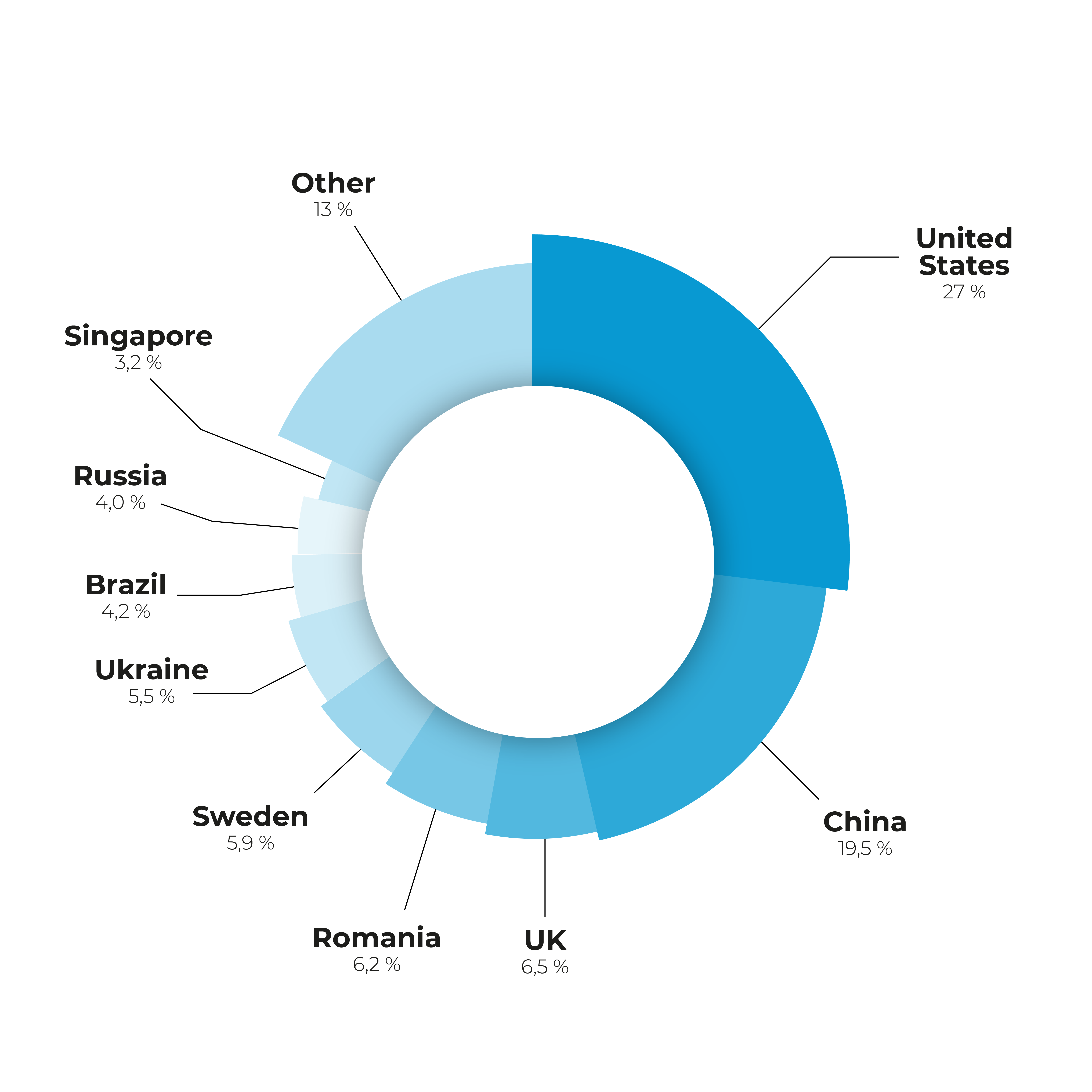 Der DDoS-Angriff wies eine Vielzahl von Angriffsvektoren auf, wodurch die Verteidigungsmaßnahmen erheblich erschwert wurden. Die Angriffsquelle umfasste insgesamt 859.756 einzigartige IP-Adressen, was auf eine starke Verteilung der Angriffsquellen hindeutet. Es ist davon auszugehen, dass eine Vielzahl von kompromittierten Geräten weltweit an dem Angriff beteiligt war. Diese Verteilung ist typisch für moderne DDoS-Angriffe, bei denen Cyberkriminelle häufig Botnetze aus IoT-Geräten oder unsicheren Home-Routern nutzen. In diesem Fall lag die primäre Herkunft des Datenverkehrs in den USA, gefolgt von China.