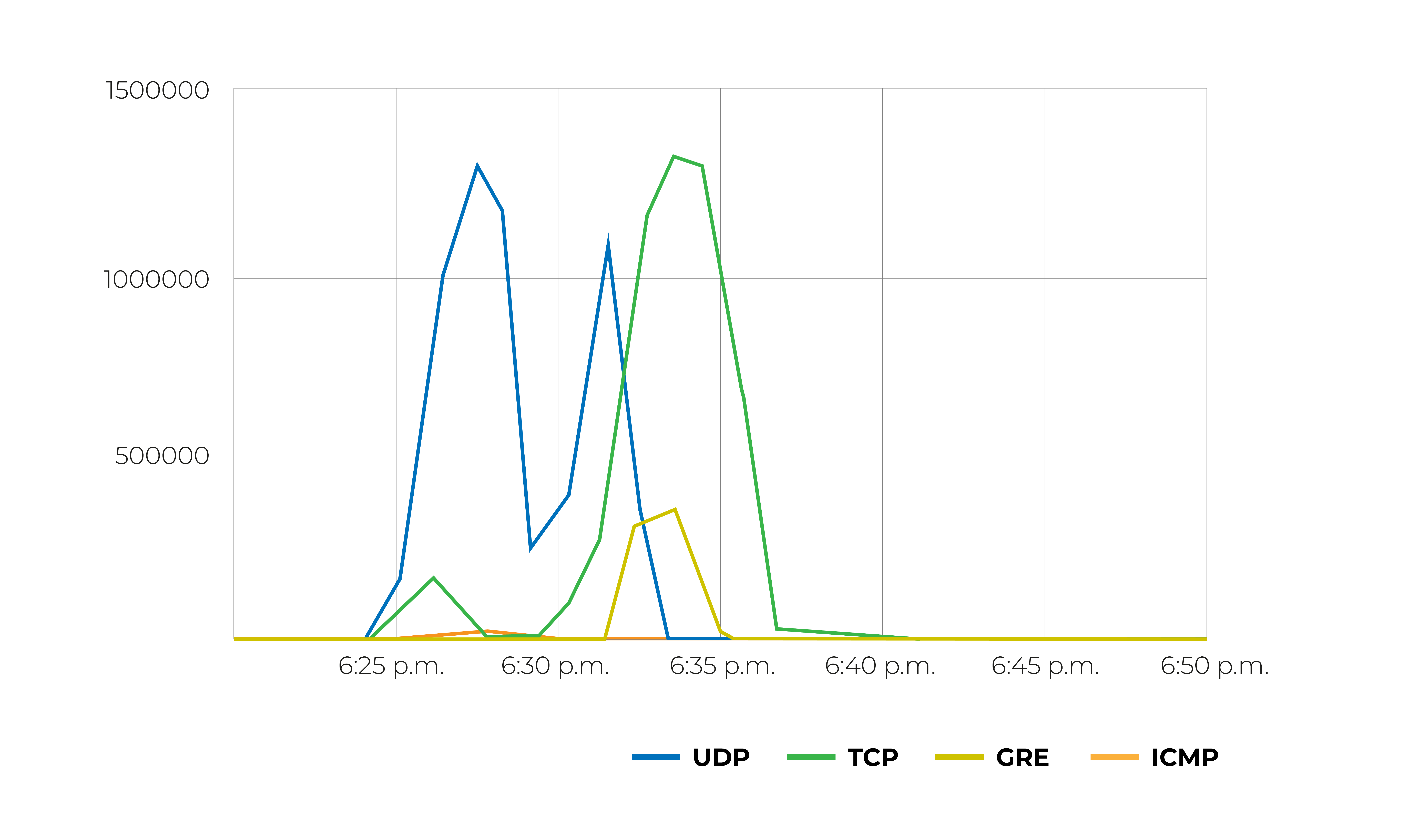 - ICMP (etwa 5 % des Angriffsvolumens). ICMP-Pakete können zur Erkennung von Netzwerkverbindungen verwendet werden, was darauf hindeutet, dass die Angreifer möglicherweise versuchten, die Netzwerkinfrastruktur zusätzlich zu überlasten.