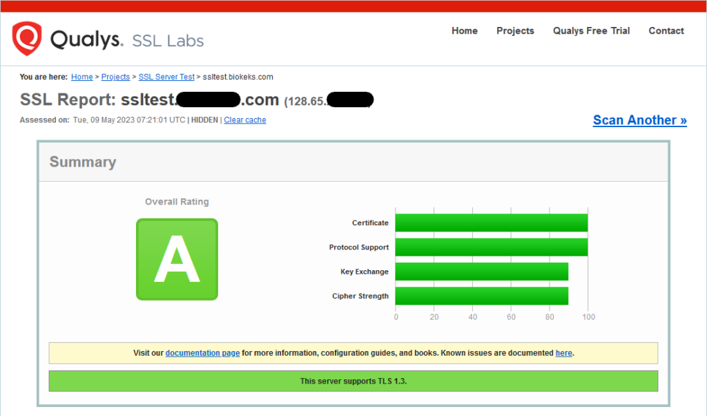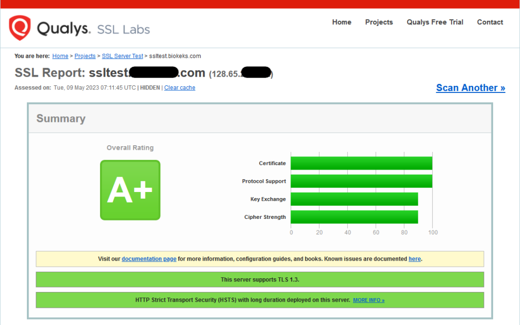 Unsere Techniker haben verschiedene Kombinationen von Chiffriersuiten und Konfigurationen getestet, um Ihnen eine A- oder sogar eine A+-Bewertung im Qualys SSL-Servertest zu ermöglichen. Die gute Nachricht ist, dass Sie auch mit unserer Standardkonfiguration eine A-Bewertung im Qualys SSL-Servertest erhalten.