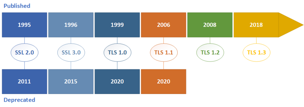 SSL gibt es seit den frühen 90er Jahren, um 2010 startete die Browsererweiterung HTTPS Everywhere eine erste Initiative, um die Verwendung von HTTPS verbindlich zu machen. Die aktuellen Versionen von TLS wurden 2008 (TLS v1.2) bzw. 2018 (TLS v1.3) eingeführt. Seit 2020 bieten alle großen Browser einen reinen HTTPS-Modus an, so dass HTTPS zum De-facto-Standard für die Datenkommunikation im World Wide Web geworden ist.