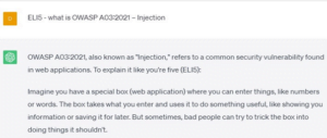 Jetzt ist unser imaginärer Pen-Tester ein paar Monate in seiner/ihrer Karriere weitergekommen und ist ein etwas erfahrener Penetration Tester geworden. Heute wollen wir etwas über A03:2021 – Injektionsangriffe lernen. Fragen wir ChatGPT.