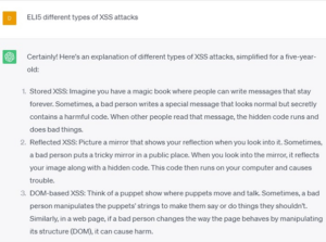 Wir werden ChatGPT weiterhin über verschiedene Arten von Injektionsangriffen befragen. Wir bitten ChatGPT weiterhin um ELI5-Erklärungen zu verschiedenen Arten von Injektions- und XSS-Angriffen. Zum Schluss möchte ich unsere Hand auf einen XXS-Angriff legen und um Beispiele und weitere Erklärungen bitten.