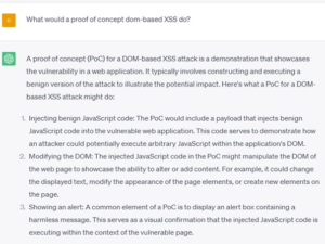 Mit weiteren Fragen finden wir heraus, dass es verschiedene Arten von XSS-Angriffen gibt, und wir beschließen, dass dom-basierte XSS-Angriffe leicht zu testen sind, und wir bitten um Proof-of-Concept-Angriffe.