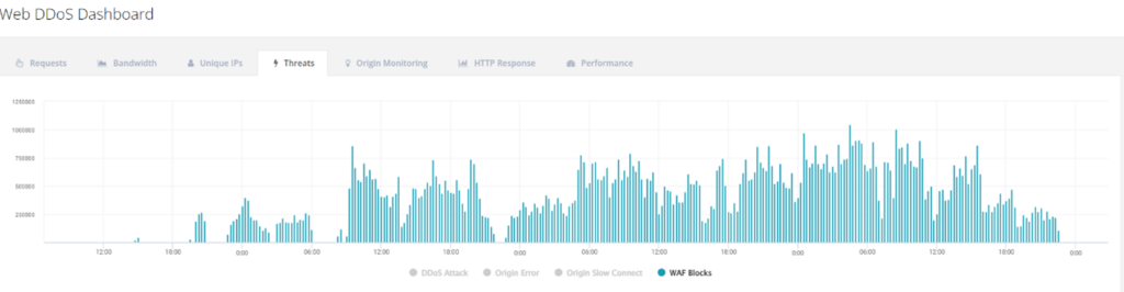 - Millions of WAF blocks in just 30 minutes – a volume far beyond normal levels.