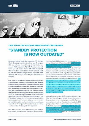 RTL Germany Media Group’s production, broadcast and IT company CBC has switched from ad hoc protection to the permanent DDoS protection of Link11. The on-premise networks now only receive filtered B2B traffic from Link11. This means there are no delays when it comes to averting risks. The potential danger of being exposed to DDoS attacks is still assessed as “real” by the Cologne-based company.
