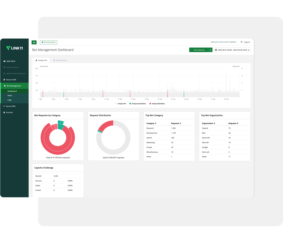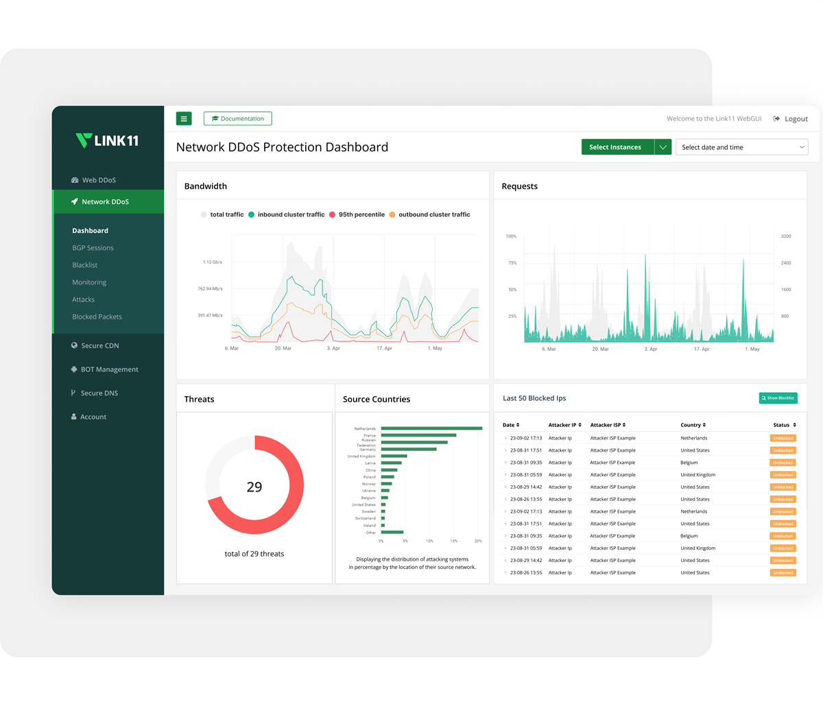Real-time DDoS Protection: AI-powered defense continuously learns from all attacks blocked by Link11 and reliably keeps attackers at bay thanks to patented technology — with zero time to mitigate for known vectors and guaranteed mitigation in under 10 seconds for new vectors.