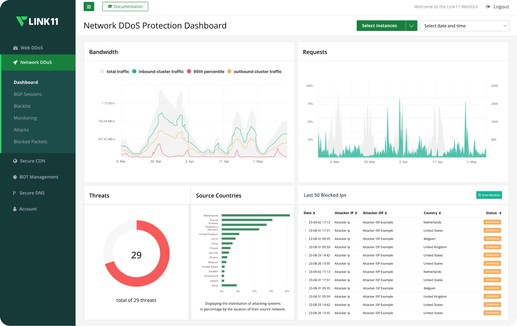 With Link11 Network DDoS Protection, you can rely on a cloud-based solution powered by Machine Learning (ML) to protect your business assets from even the largest threats. Our patented system evolves continuously, providing 24/7 automatic protection and ensuring 100% uptime.