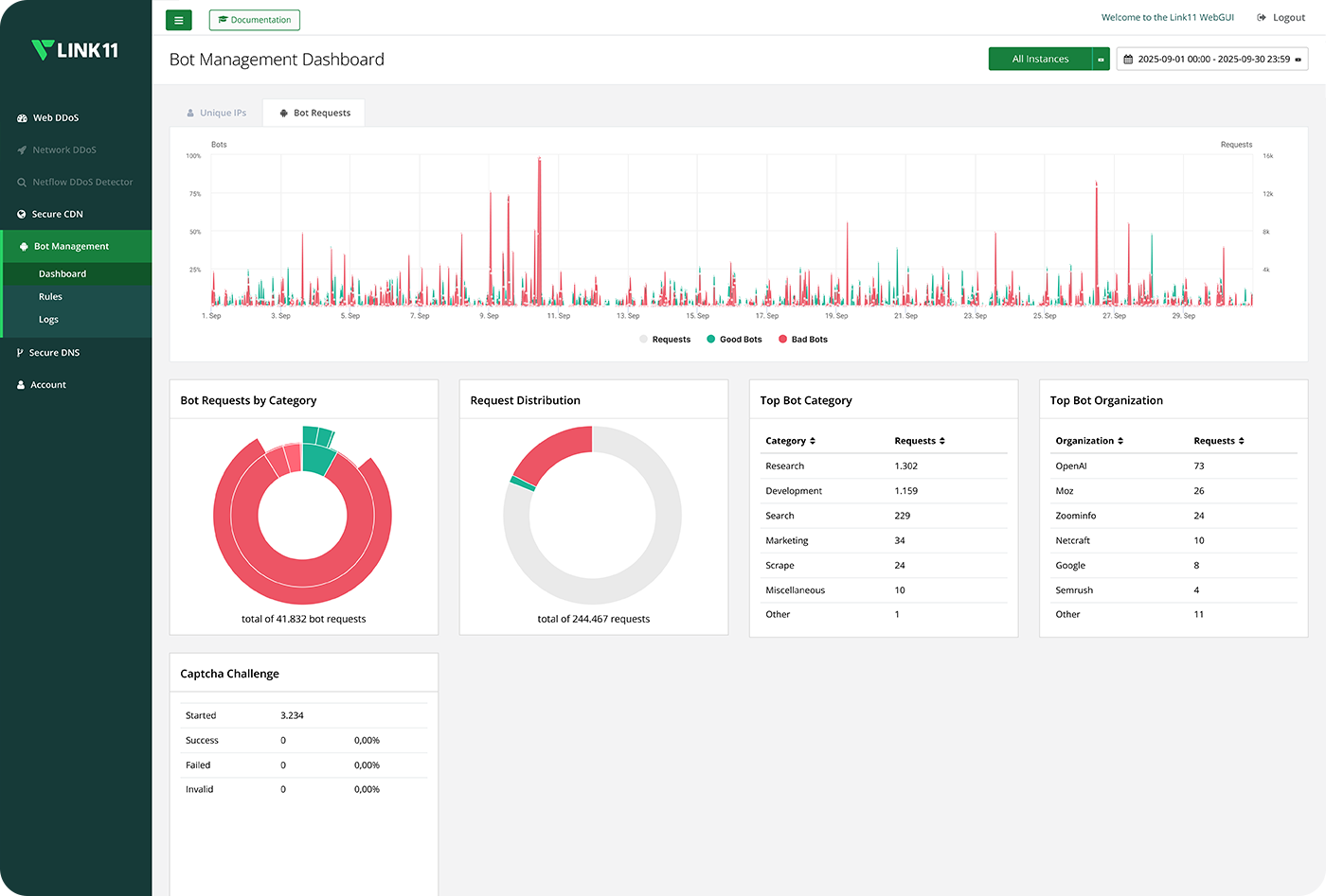 Traditional bot protection methods such as reCAPTCHA or IP blocklists are easy to circumvent. Link11 relies on modern detection with client authentication and biometric analysis, stops automated attacks of all kinds, and provides reliable protection against data theft, scraping, and DDoS—fully managed, always up to date, and with 24/7 support.